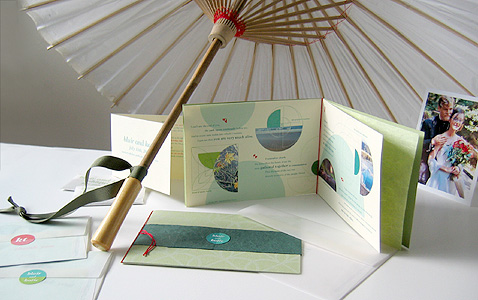 the groom, hand-carved rubber stamps by the bride, and Asian-inspired