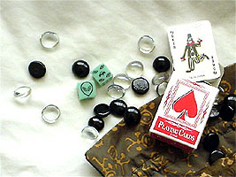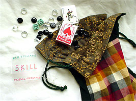 Lined drawstring bag with gameboard patch. Holds glass game pieces, miniature playing cards and alien-theme dice.