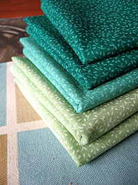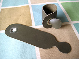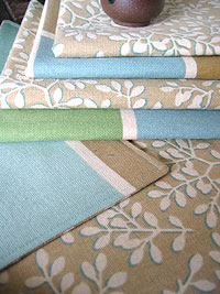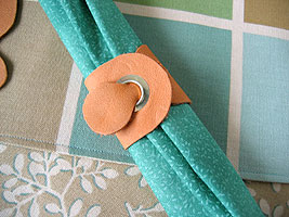 Handsewn cotton canvas reversible placemats, cotton napkins, leather napkin rings. Color scheme selected based on dishes the bride had registered for. Napkin rings made from recycled furniture sample leather swatches, with existing eyelets.