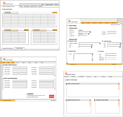 < > After a preliminary review where several of our concepts were selected, we went on to develop those into realistic screen-interface views, using a range of screens to test the versatility of the ideas. We developed a presentation to the Kintana executives, and were delighted when they selected our best idea, an efficient "powerful" look with gray backgrounds to pull the white content areas forward. The strong contrasts and bold attitude fit the Kintana brand perfectly.